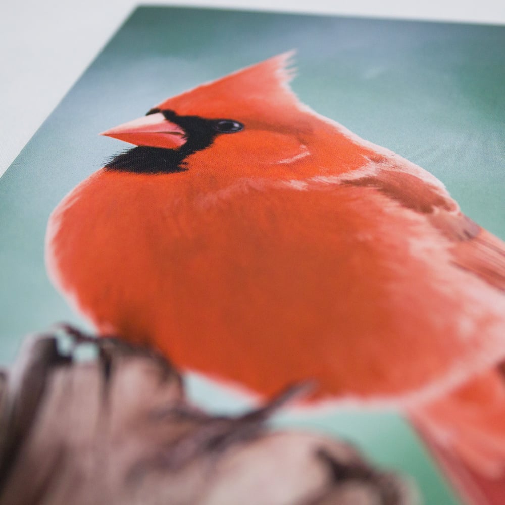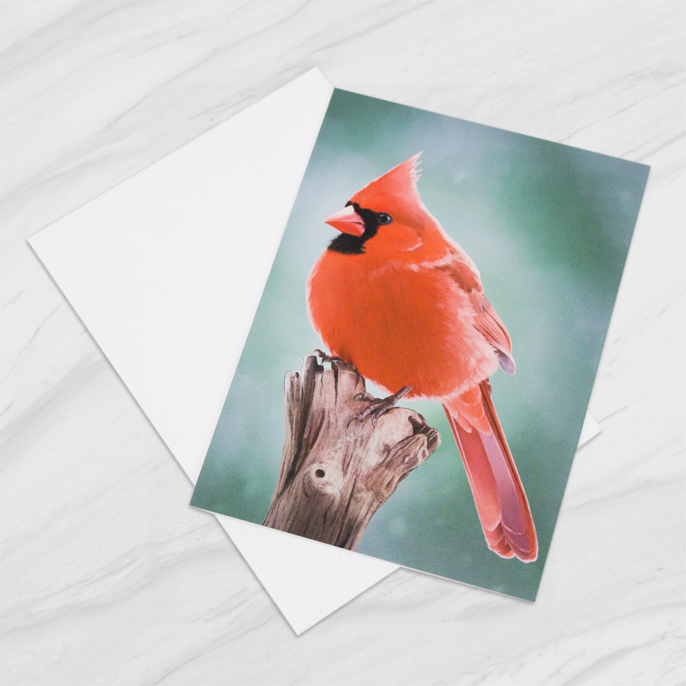 Set of five blank notecards featuring the painting "Winter Vermilion" by Megan Russell. All five notecards show a portrait of a male Northern Cardinal, native to North America.