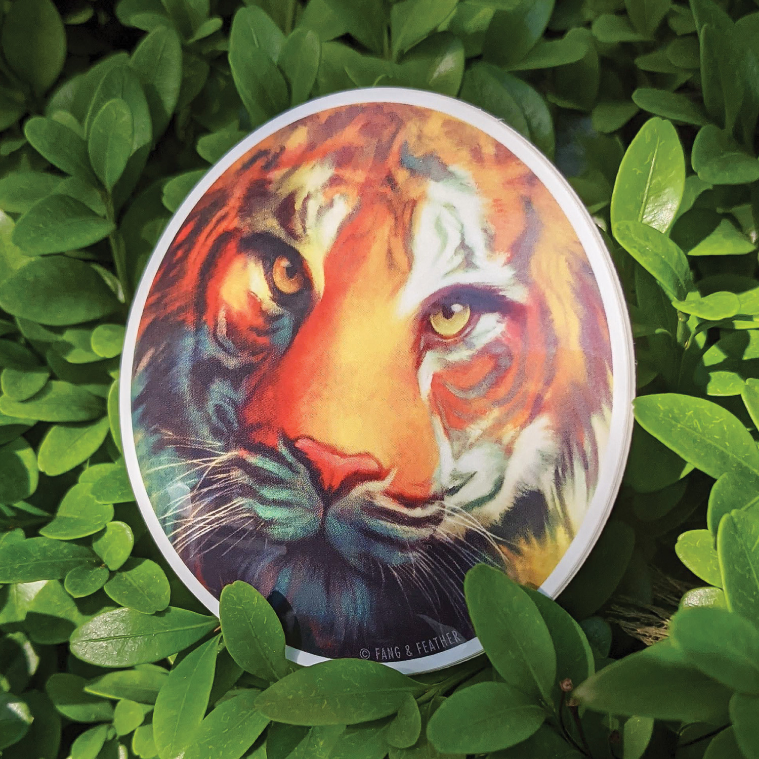 This is a 3 inch x 3 inch circle vinyl sticker featuring the digital painting "tigris" by Megan Russell. The painting is of a male Sumatran Tiger, native to the Indonesian island of Sumatra and critically endangered.