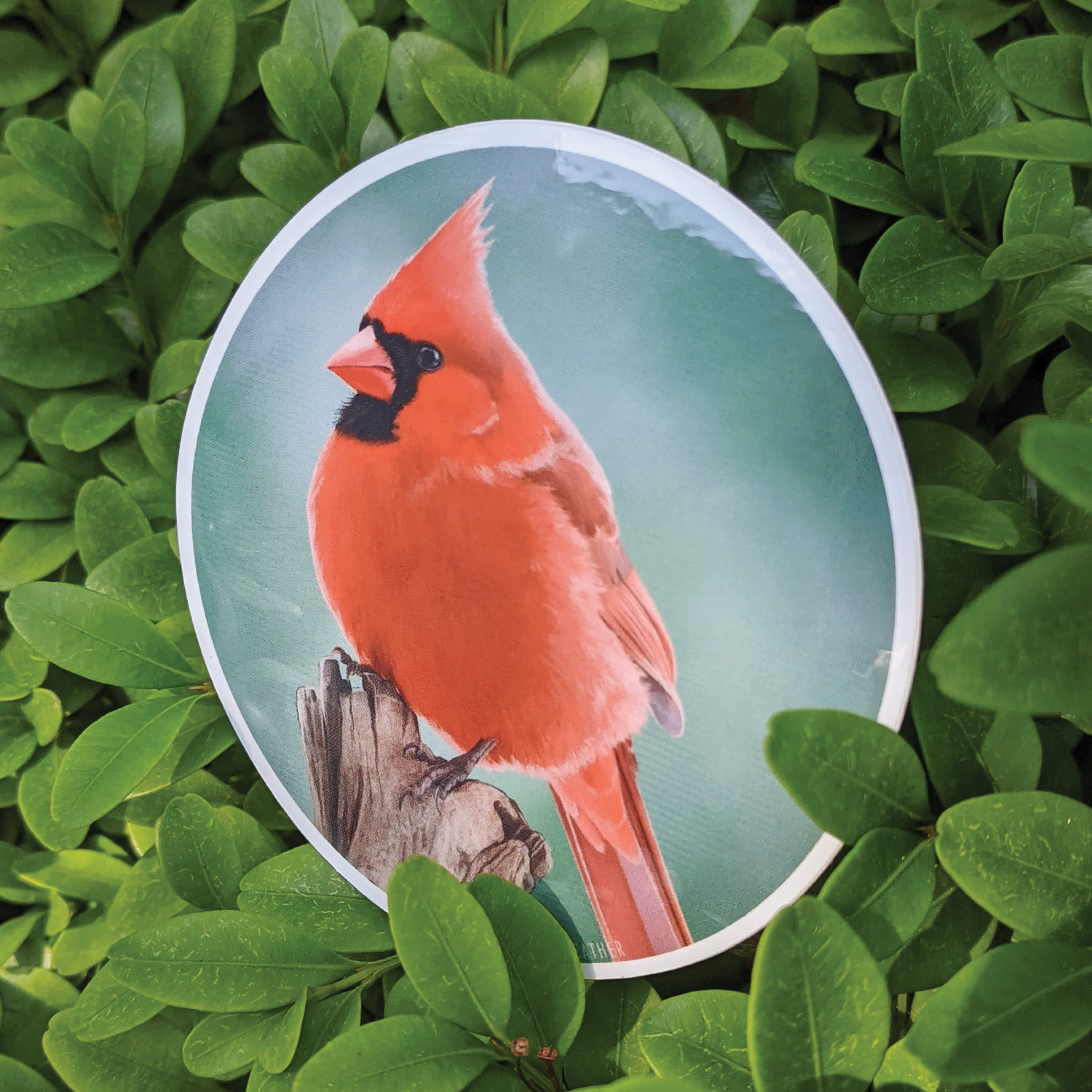 This is a 3 inch x 3 inch circle vinyl sticker featuring the digital painting "Winter Vermilion" by Megan Russell. The painting is of a male Northern Cardinal, native to North America.