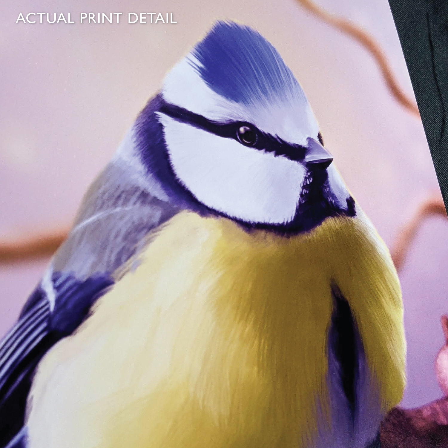 This is an open edition giclée print of the digital painting "Magical Blue Tit" by Megan Russell. It is professionally printed on 68 lb archival paper with a satin finish. The print will be hand-signed by the artist on the front with black ink and will not include the watermark.