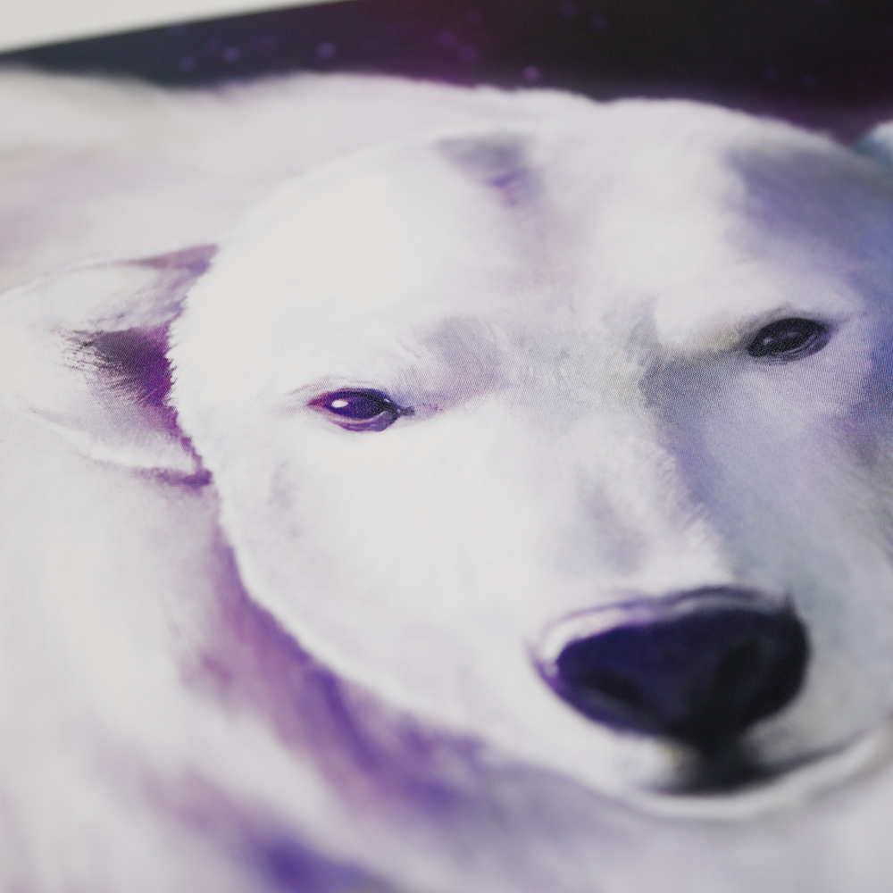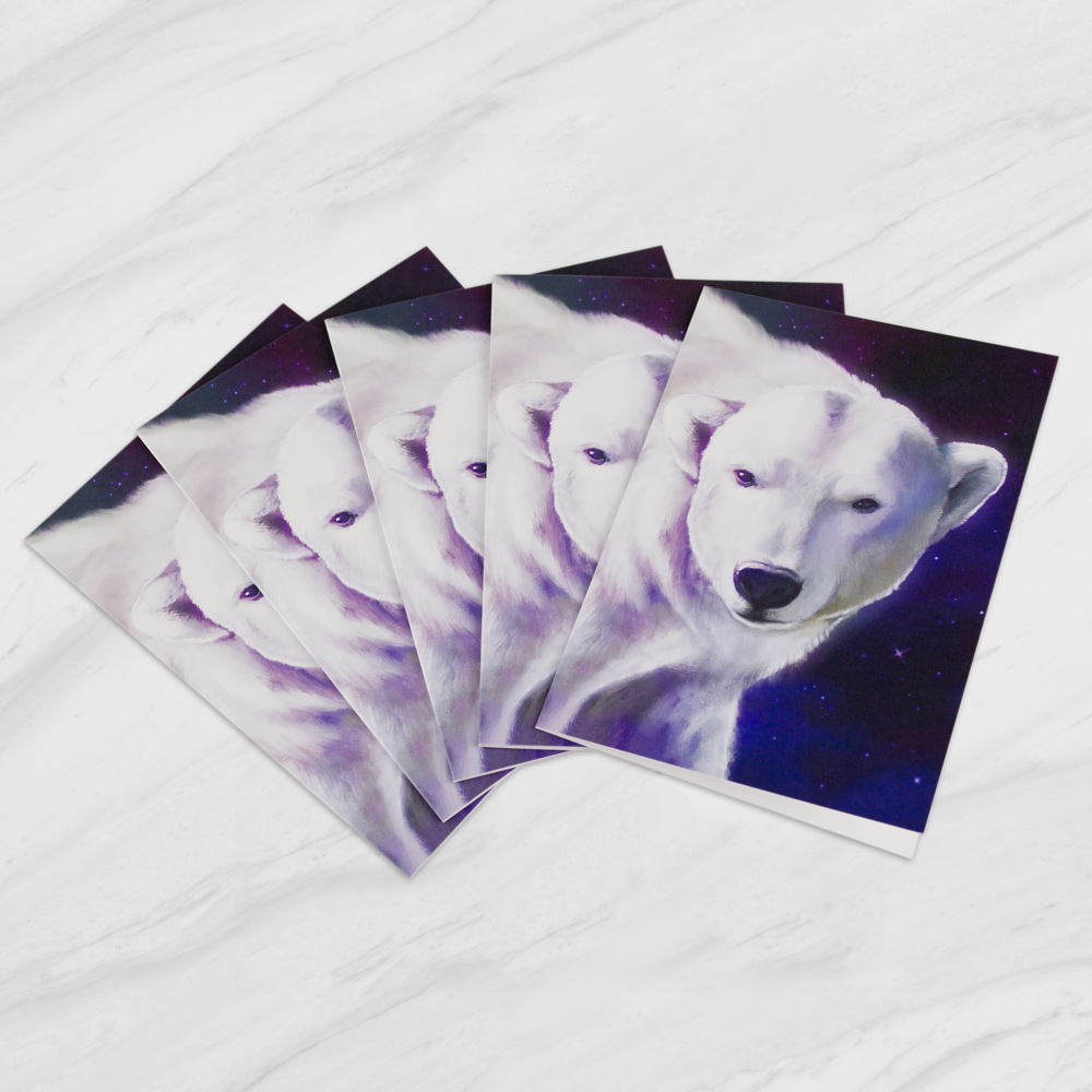 Set of five blank notecards featuring the painting "Berlin" by Megan Russell. All five notecards show a portrait of the female polar bear named Berlin, who is the oldest known polar bear in human care.